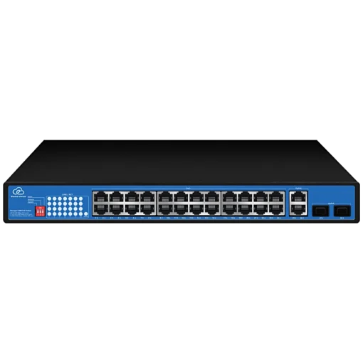 ● Downlink порти: 24x RJ45 (100M);● Uplink порти: 2x RJ45 (1000M), 2x SFP (1000M);● Живлення: AC100~240V;● Робоча температура: -20º – +55ºC;● Підтримує віддалене керування хмарною платформою EWIND та роботу мобільної програми, пропонуючи різні оповіщення в реальному часі, виявлення несправностей та перезапуск порту тощо;● Стандарти PoE IEEE 802.3af/at 15,4 Вт/30 Вт на порт бюджет 300Вт;● 330 х 215 х 44 мм