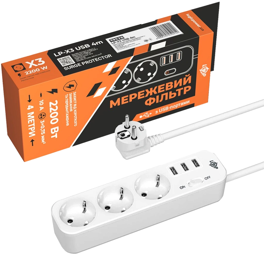 3 порти USB Type-A автоматично визначають найкращий струм для живлення пристрою. 3 розетки 220 Вольт. Отвори для кріплення до стіни. Перемикач ON/OFF контролює всі розетки змінного струму та USB-порти разом. Вбудований запобіжник автоматично спрацює для захисту від перевантаження. Підходить для підключення електричних пристроїв сумарною потужністю 2200 Вт. Можна використовувати для підключення та заряджання (без блоку живлення) мобільних пристроїв, наприклад: iPad, iPhone, MacBook, Android, смартфон, повербанк, гарнітура тощо.