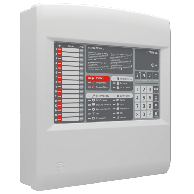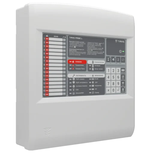 ● Базові зони: 16;● Сповіщувачів в зоні: 32;● Напруга в зоні: 24 В;● Виходи: “Пожежа”, “Несправність”, 2 релейні виходи для оповіщення чи контролю автоматики;● Інтрефейси: 2x RS-485 (довжина шини до 1000 м), USB-C, Ethernet;● Розширення (через RS-485): до 16 пристроїв загалом, до 8 M-OUT8R або M-OUT2R box, до 8 ПУІЗ Tiras 1X;● Основне живлення: 220 В;● Резервне живлення: АКБ 2x 7-8 А•год;● 280х280х80 мм
