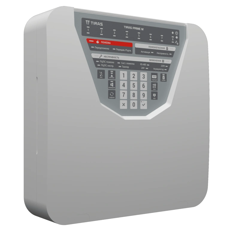 ● Базові зони: 8;● Сповіщувачів в зоні: 32;● Напруга в зоні: 24 В;● Виходи: “Пожежа”, “Несправність”, 2 релейні виходи для оповіщення чи контролю автоматики;● Інтрефейси: RS-485 (довжина шини до 1000 м), USB-C;● Розширення (через RS-485): до 8 пристроїв загалом, до 4 M-OUT8R або M-OUT2R box, до 4 ПУІЗ Tiras 1X;● Основне живлення: 220 В;● Резервне живлення: АКБ 7-9 А•год;● 280х280х80 мм
