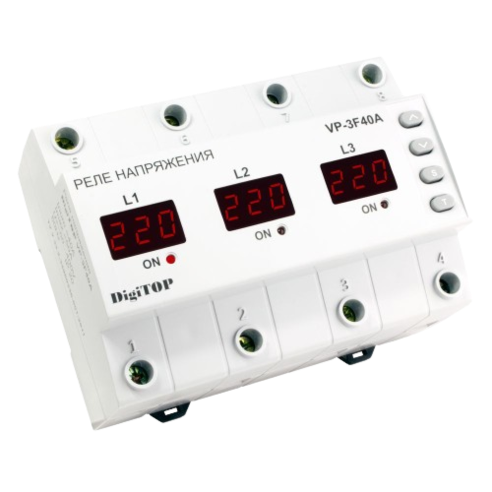● Трифазне реле напруги VP-3F40А призначене для захисту трифазних споживачів від перепадів напруги, асиметрії фаз, пропадання фаз, контролю порядку чергування фаз. Пристрій запобігає виходу з ладу та продовжує термін експлуатації електроустаткування;● З можливістю вибору режиму роботи як трифазне або як три незалежні однофазні реле;● Програмовані налаштування: значення верхньої та нижньої меж відключення за напругою, час затримки включення, значення допустимої асиметрії фаз, синхронний/асинхронний режим роботи, контроль порядку чергування фаз.
