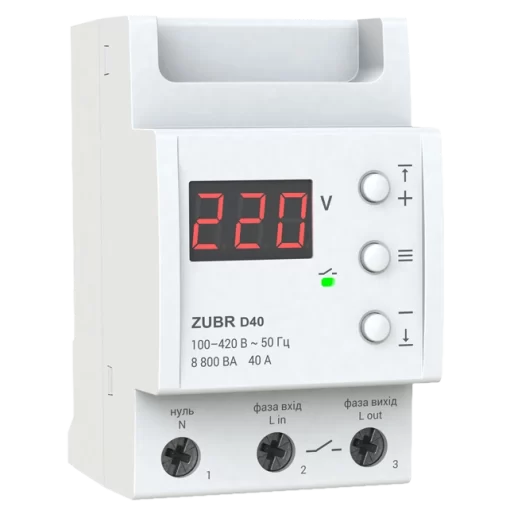 Струм, А: 40; Спосіб монтажу: На DIN-рейку; Кількість фаз: 1 ф. (230 Вольт). Реле напруги ZUBR D25-63 призначені для захисту обладнання від надмірних коливань напруги в мережі. При настанні аварійної ситуації реле вимикає навантаження. Застосовується в однофазних мережах змінного струму (230 В). Після стабілізації напруги активується таймер затримки подачі навантаження. Ви можете налаштувати його тривалість від 3 до 600 с. Для обладнання, чутливого до частих вимкнень напруги (наприклад, для холодильників, кондиціонерів і теплових насосів), рекомендований час затримки становить 120-180 с.